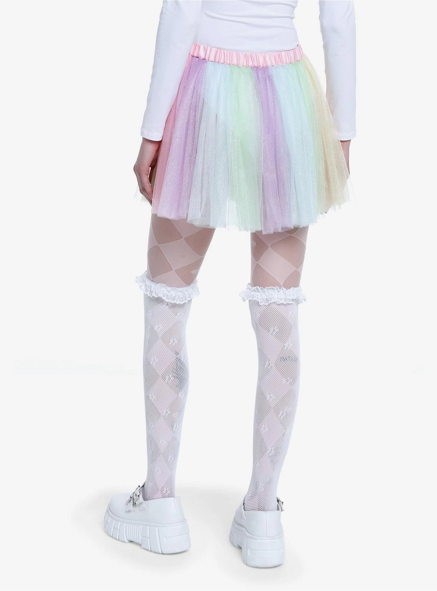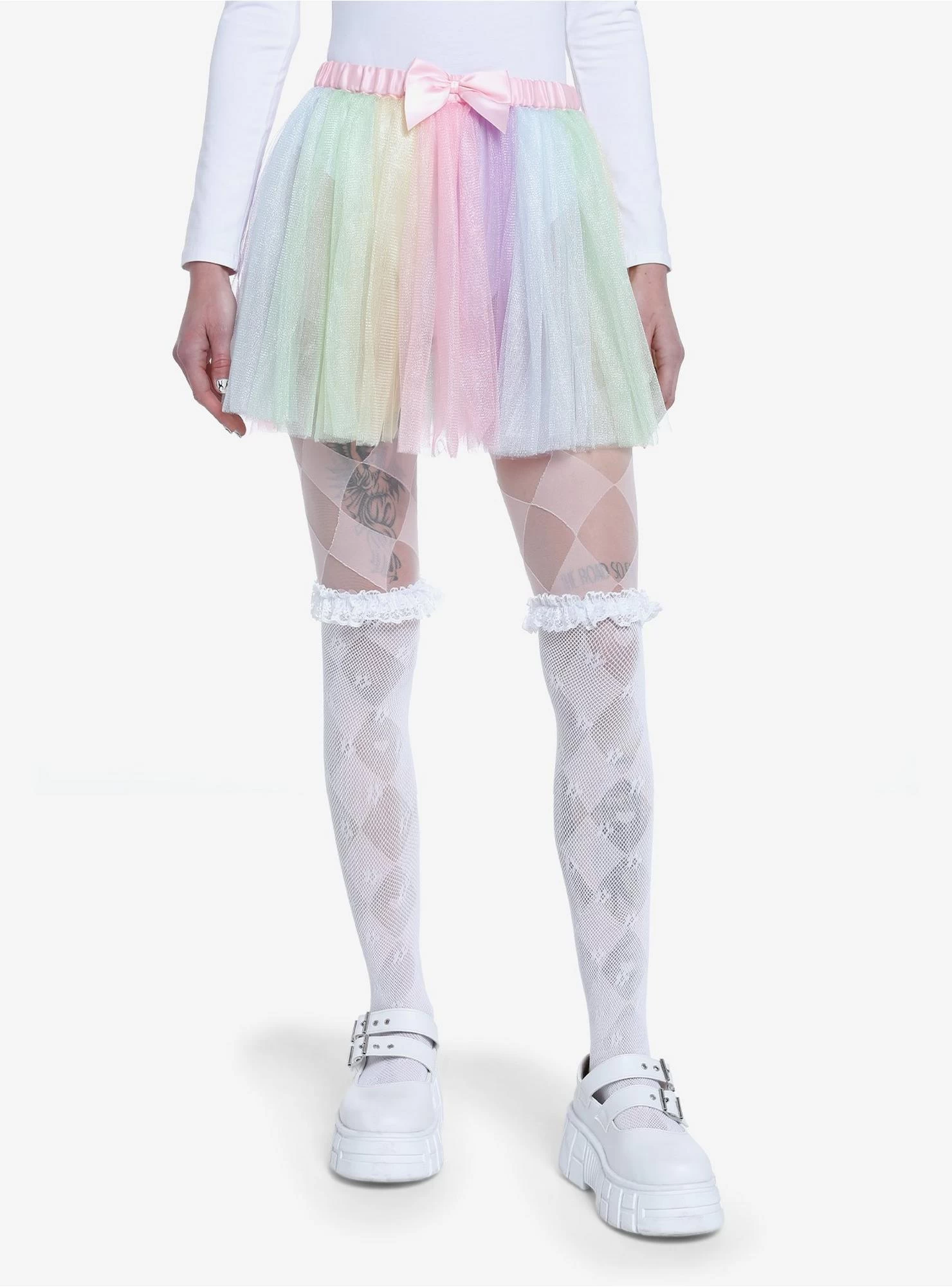 Twirl around in a new and colorful tutu! This pastel rainbow tulle skirt has a pink satin elastic waistband with a bow at the center.