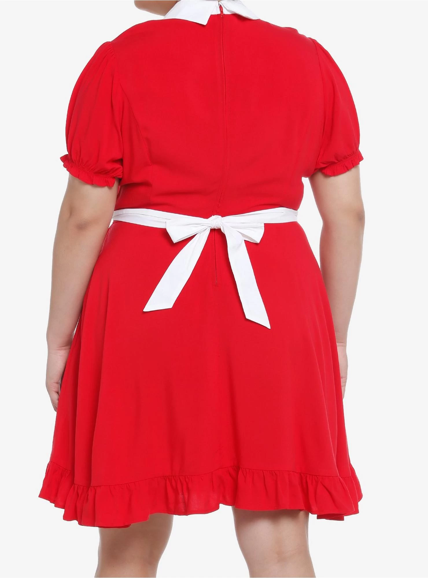 Whether you’re berry picking with the girlies, or frolicking through a meadow, this sweet dress is perfect for the occasion! This red dress features a removable apron with ruffle trimming and a white bib and peter pan collar with red bow and button accents. Comes with puff sleeves, ruffle hem and side seam pockets. Complete with a back zipper closure.
