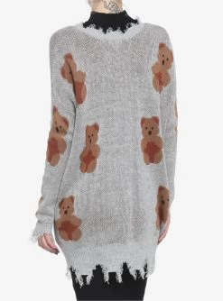 This sweater dress just wants to be your teddy bear! Perfect as a seasonal layering piece, it’s knitted with teddy bears and has distressing on the hem, neck and wrists.