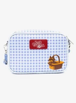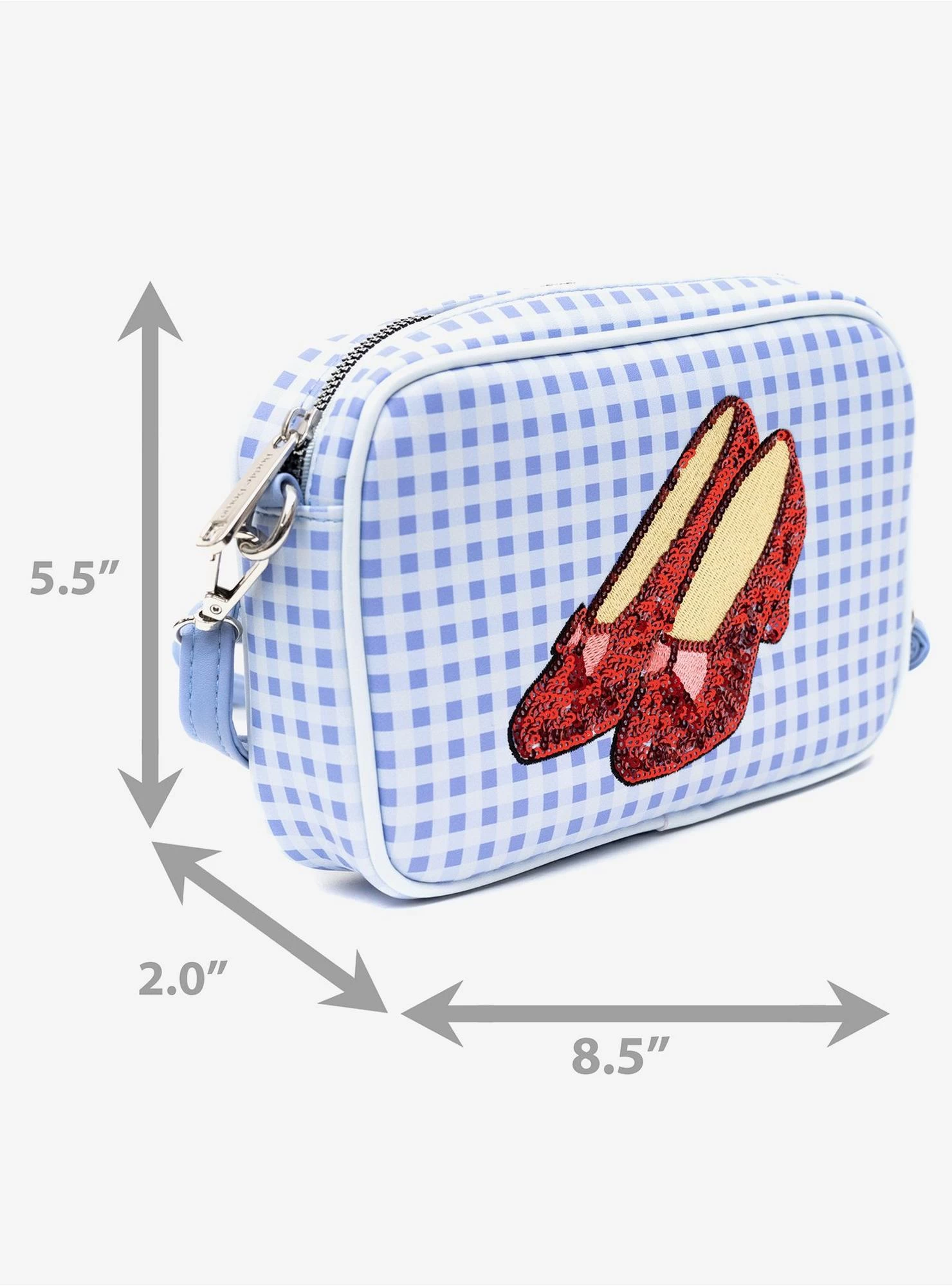 This stylish and versatile crossbody bag features an eye-catching sequined Ruby Slippers design with Toto Basket Pose, set against a timeless Gingham Checker Blue background. Crafted from durable Vegan Leather, this bag is both elegant and practical, with an adjustable strap that can be worn between 34-68 inches for a comfortable fit.