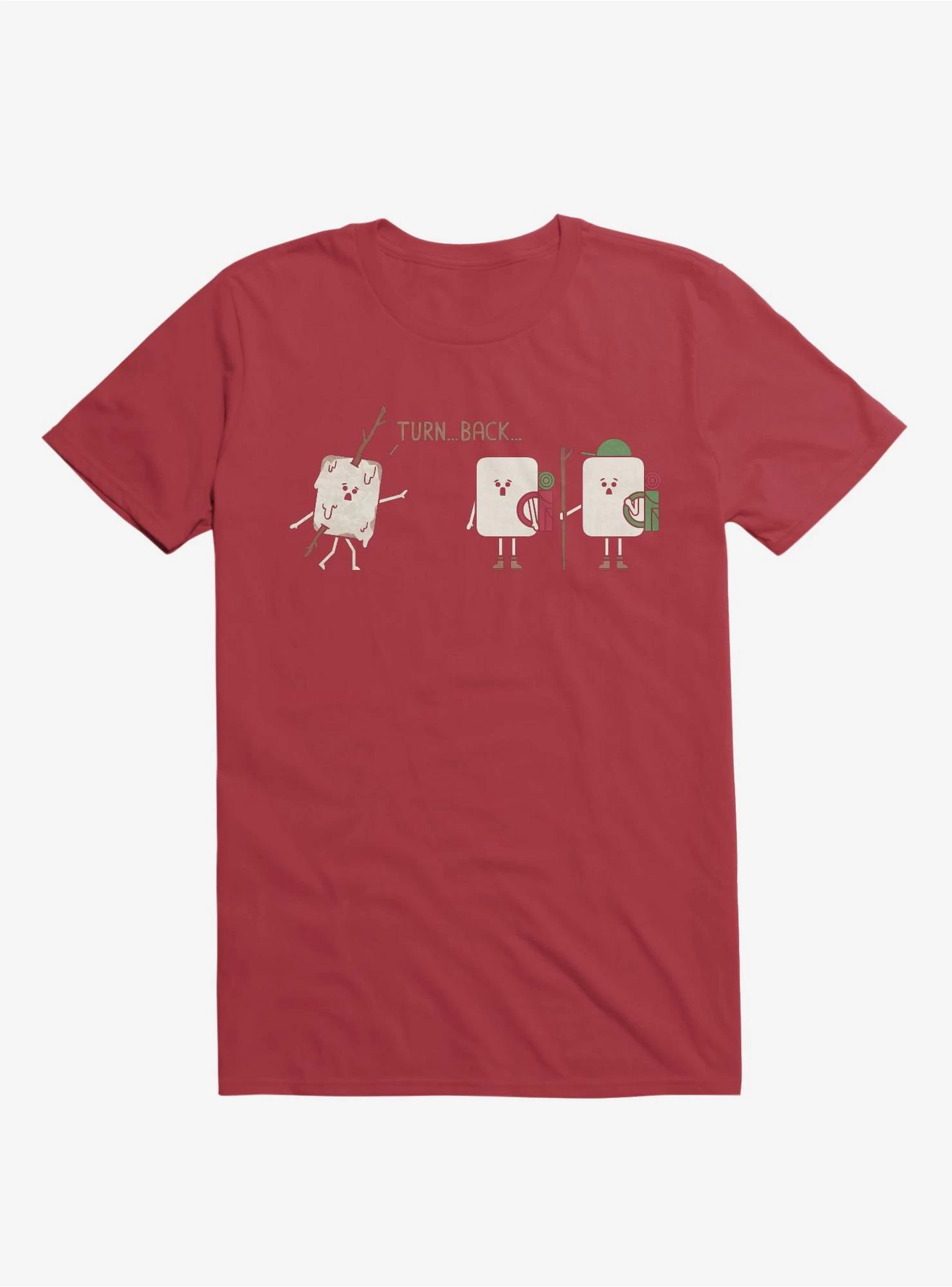 Camping is fun… unless you’re a marshmallow. This lightweight red tee features an image of a poked, burnt marshmallow warning its fellow marshmallows to “turn back.”