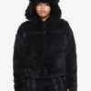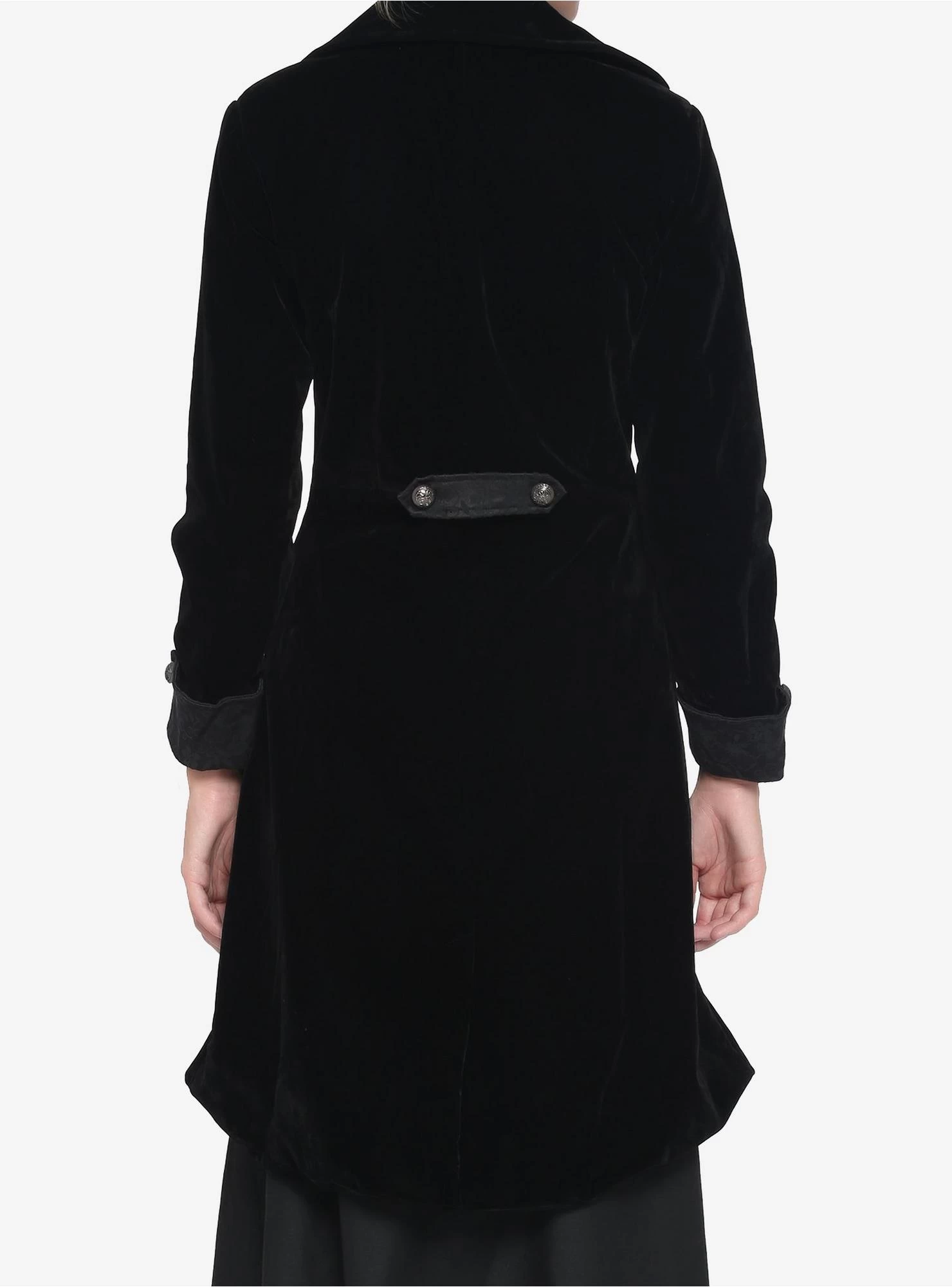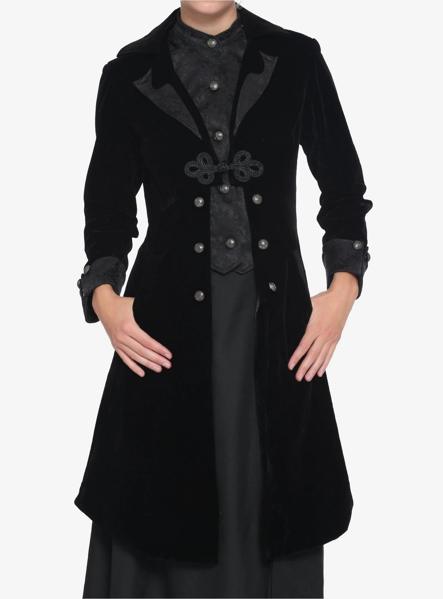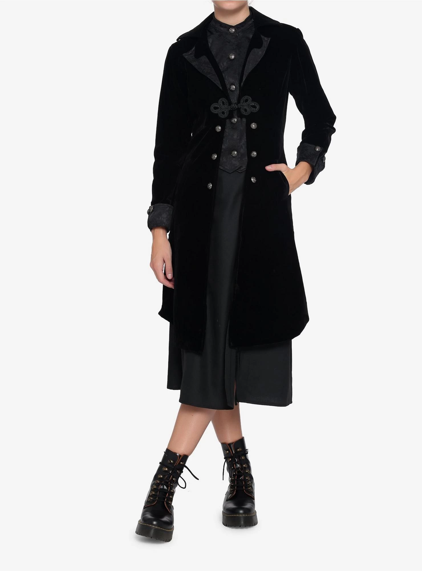 Delight in the darkness, but don’t catch a cold! If a night out is in the cards, keep all eyes on you with this velvet brocade trim coat. Features burnished silver tone hardware, cuffed sleeves and embroidered front latch detail.