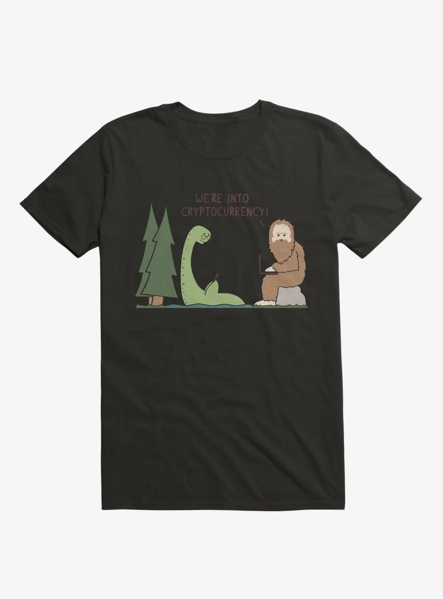 Digital cash is where it’s at… just ask these urban legends. The Loch Ness Monster and Bigfoot are all about cryptocurrency on the front of this lightweight black tee.