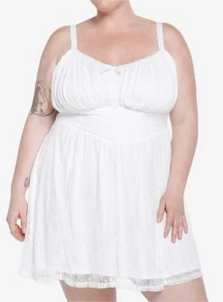 Keep your look angelic with the perfect dress on! This cami dress has a white lace layer on top with a faux corset design under the shirred bust. Comes with appliquรฉ angel wings on the adjustable cami straps and pockets at the skirt.