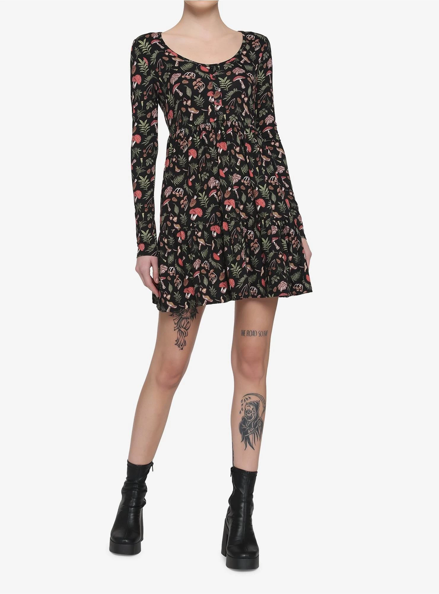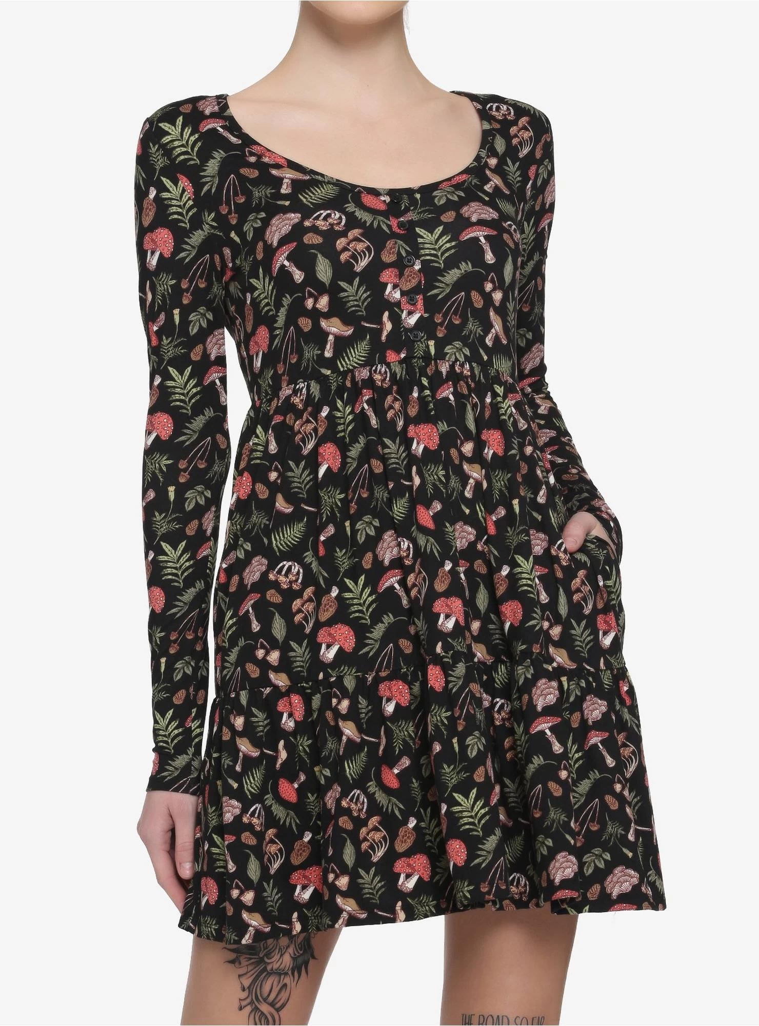 Wear your love for mushrooms as you take a stroll through the woodland forest in this soft and stretchy dress! Featuring an allover print of mushrooms and leaves, faux button up detailing, tiered skirt and pockets!